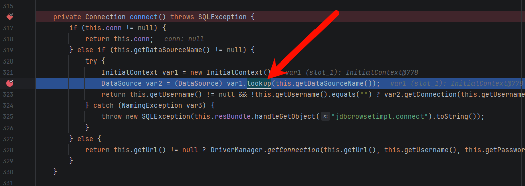 第四步:setAutoCommit 触发 JNDI lookup