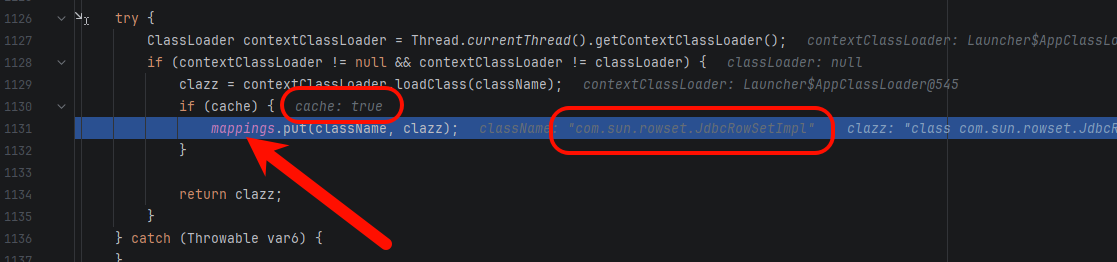 由于第一阶段已经把 com.sun.rowset.JdbcRowSetImpl 存入了缓存,这里直接命中,返回了缓存中的 class: