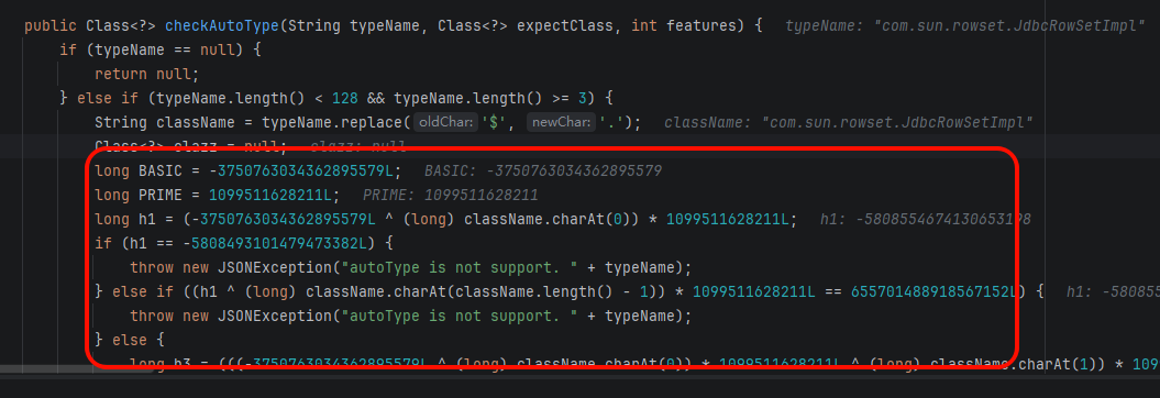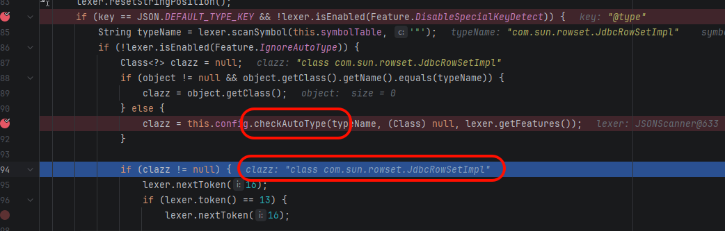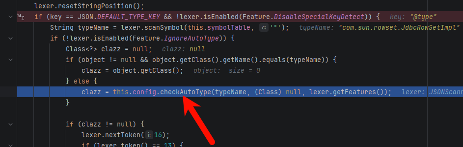 退出 checkAutoType 检测,class 依然是 com.sun.rowset.JdbcRowSetImpl,成功绕过了检测机制: