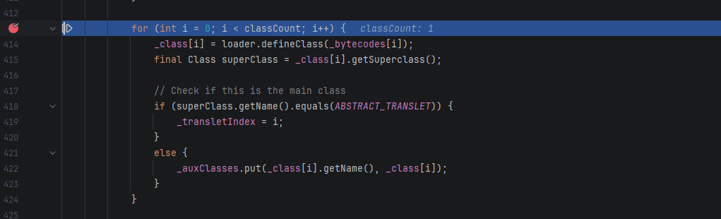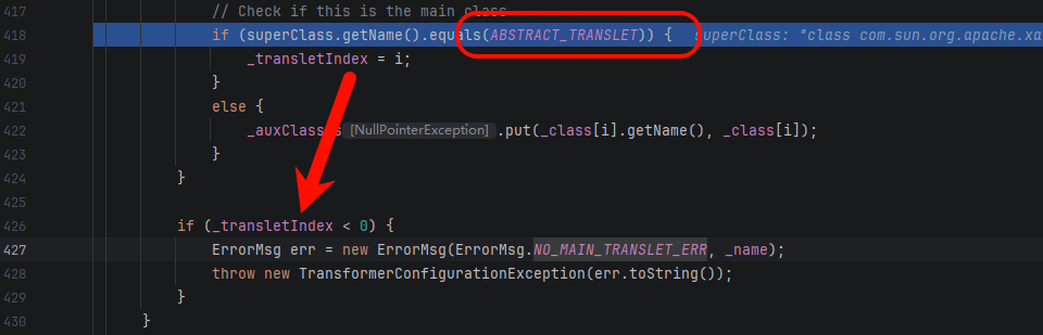 可以看到,如果检测到继承了 AbstractTranslet,_transletIndex 就不会是默认的 -1,也就不会执行下面的: