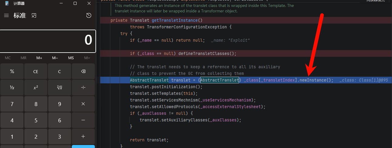 退出来后执行了 .newInstance(),计算器就弹出来了——实例化触发,构造方法里的 exec 执行。
