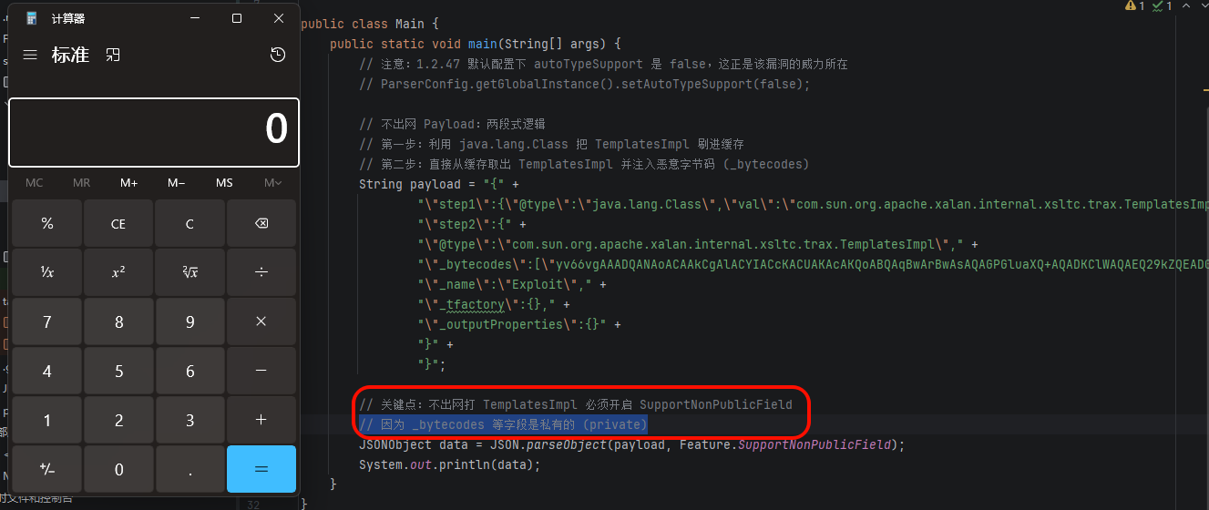 整体思路就是:把恶意 Java 字节码直接 Base64 编码塞进 JSON 里,让 FastJSON 在本地加载并实例化,不需要任何外部连接。