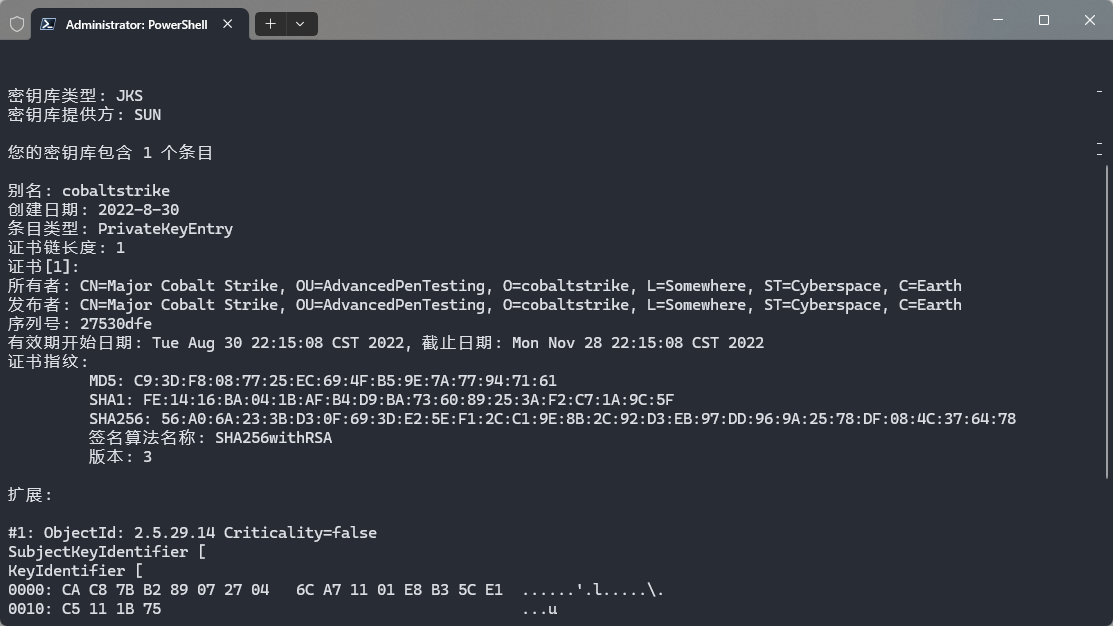 keytool.exe -list -v -keystore cobaltstrike.store