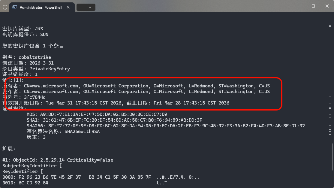 这个指纹就是刚才生成证书时看到的 SHA256 值,完全一致,说明服务端用的就是自定义证书,默认的 CS 证书特征(CN=Major Cobalt Strike)已经没了。