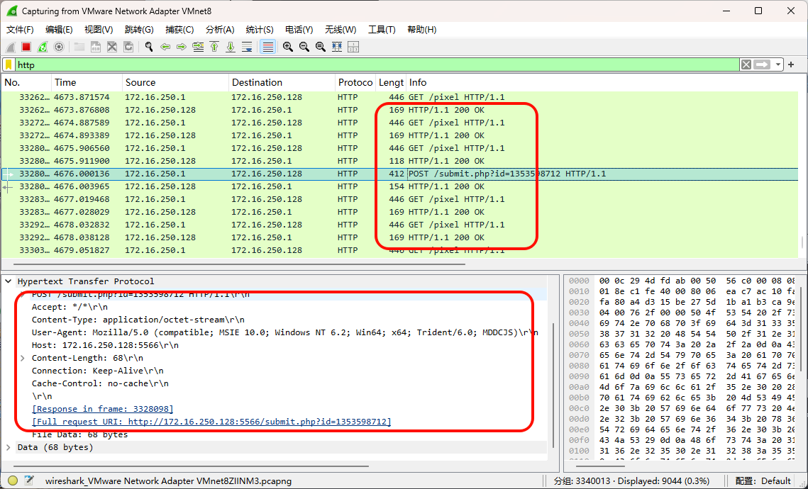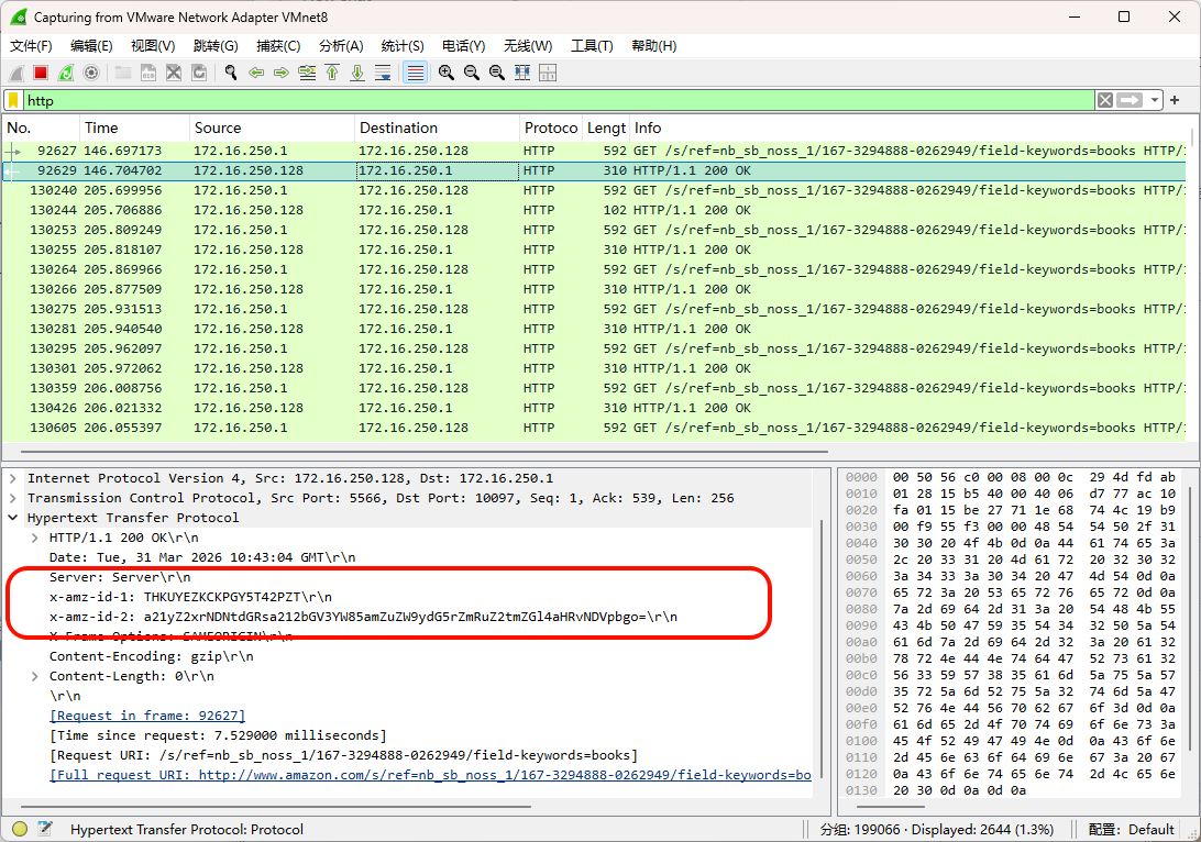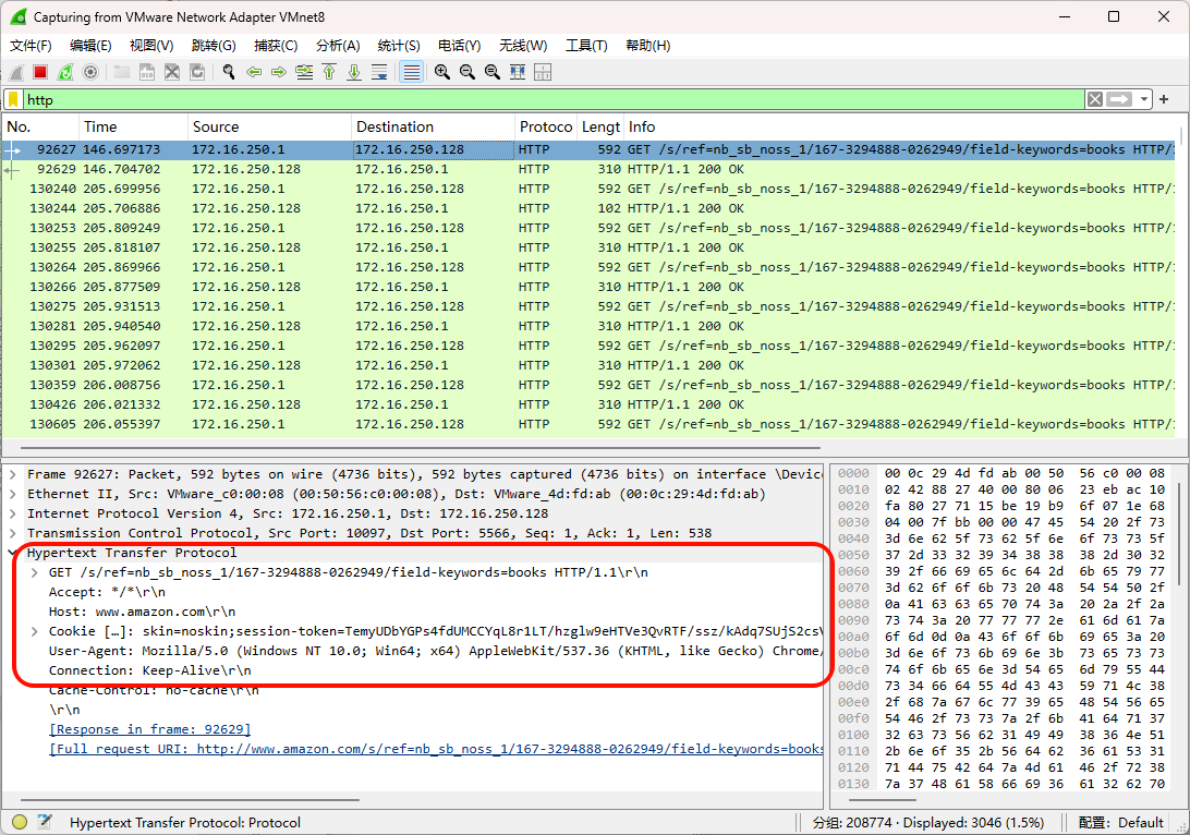 用 Wireshark 选择对应网卡抓包,过滤器输入 http:
