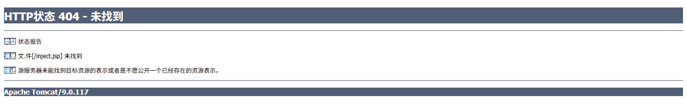 再次访问 inject.jsp 显示 404(如果不开启热加载体现不出来,即使删除了文件但没有更新资源,文件仍然存在)。