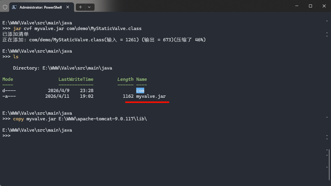 copy myvalve.jar E:\WWW\apache-tomcat-9.0.117\lib\