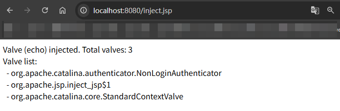 访问 http://localhost:8080/inject.jsp,可以看到注入成功,列出了当前 Pipeline 中所有的 Valve: