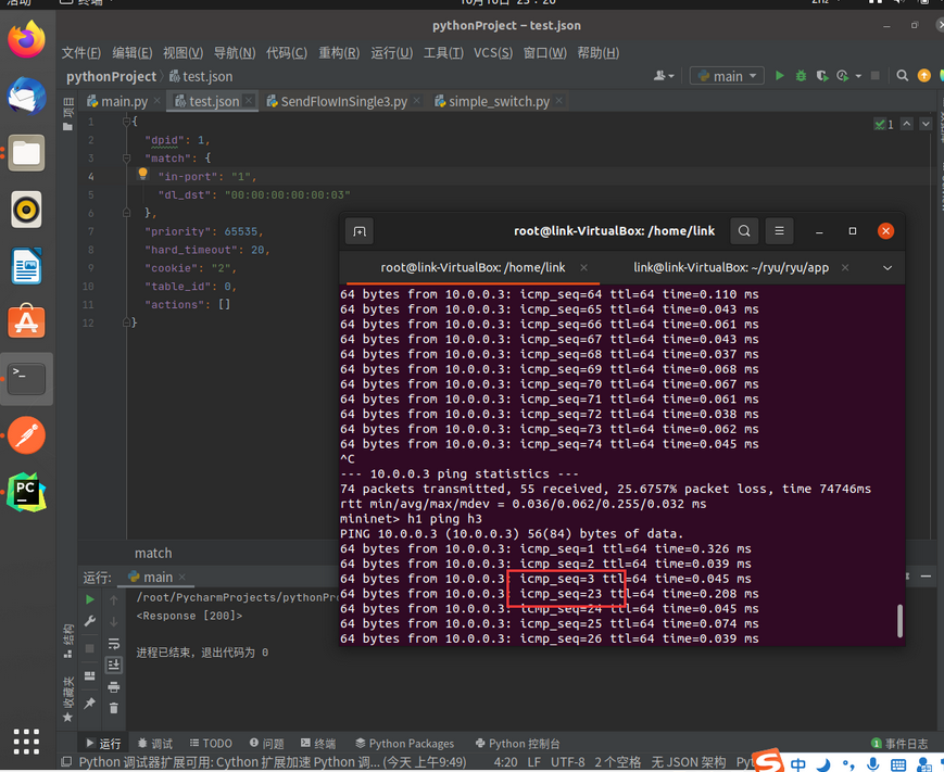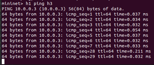 (3) 编写Python程序,调用OpenDaylight的北向接口下发硬超时流表,实现拓扑内主机h1和h3网络中断20s。