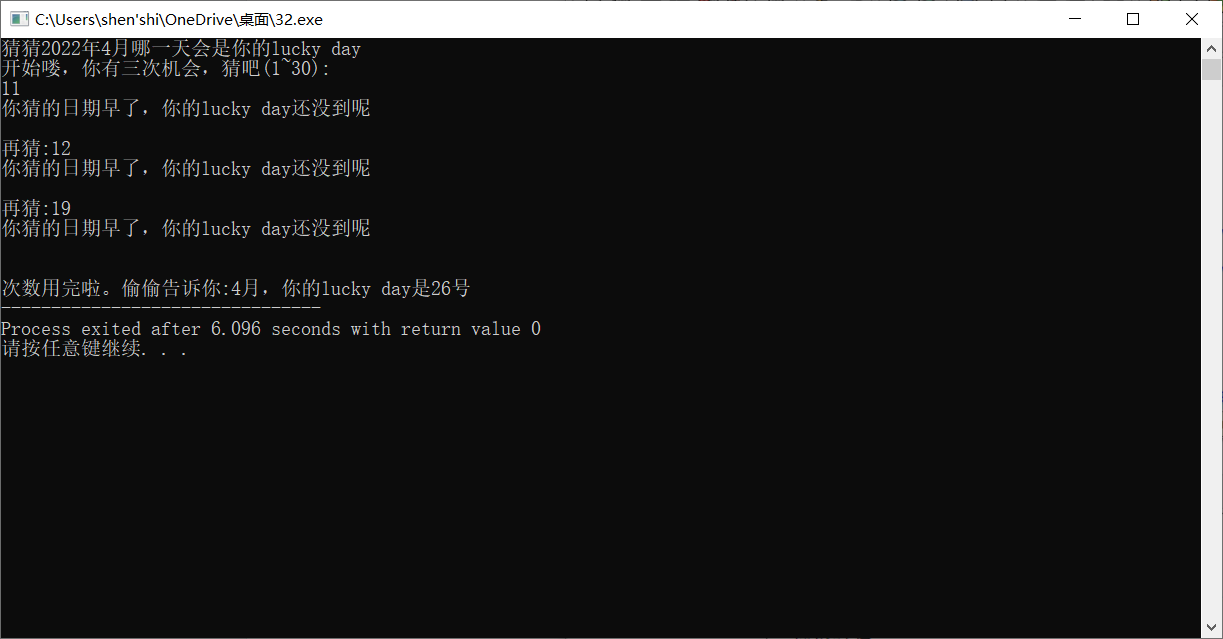 printf("\n\n次数用完啦。偷偷告诉你:4月,你的lucky day是%d号",b);