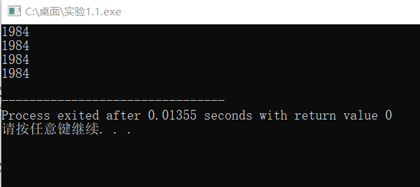 #include <stdio.h> #define N 4 int main() { char x[N] = {'1', '9', '8', '4'}; int i; char *p; // 方式1:通过数组名和下标遍历输出数组元素 for(i=0; i<N; ++i) printf("%c", x[i]); printf("\n"); // 方式2:通过指针变量遍历输出数组元素 (写法1) for(p=x; p<x+N; ++p) printf("%c", *p); printf("\n"); // 方式2:通过指针变量遍历输出数组元素(写法2) p = x; for(i=0; i<N; ++i) printf("%c", *(p+i)); printf("\n"); // 方式2:通过指针变量遍历输出数组元素(写法3) p = x; for(i=0; i<N; ++i) printf("%c", p[i]); printf("\n"); return 0; }