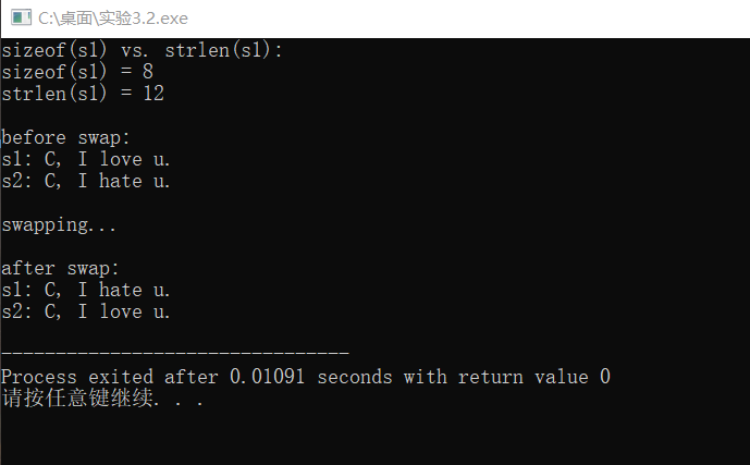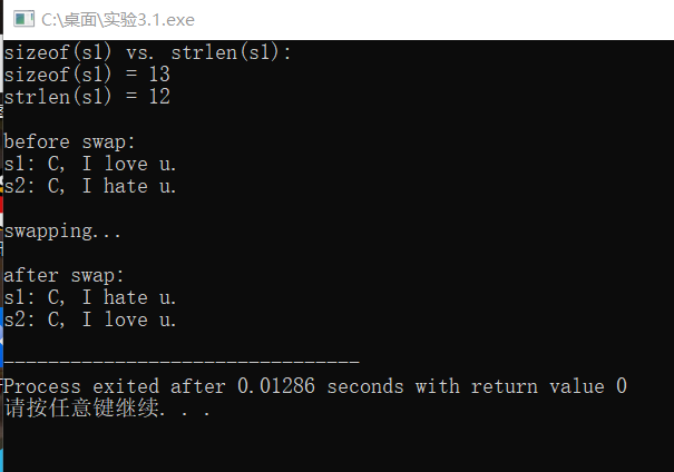#include <stdio.h> #include <string.h> #define N 80 int main() { char s1[] = "C, I love u."; char s2[] = "C, I hate u."; char tmp[N]; printf("sizeof(s1) vs. strlen(s1): \n"); printf("sizeof(s1) = %d\n", sizeof(s1)); printf("strlen(s1) = %d\n", strlen(s1)); printf("\nbefore swap: \n"); printf("s1: %s\n", s1); printf("s2: %s\n", s2); printf("\nswapping...\n"); strcpy(tmp, s1); strcpy(s1, s2); strcpy(s2, tmp); printf("\nafter swap: \n"); printf("s1: %s\n", s1); printf("s2: %s\n", s2); return 0; }