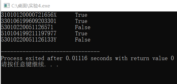 #include <stdio.h> #include <string.h> #define N 5 int check_id(char *str); // 函数声明 int main() { char *pid[N] = {"31010120000721656X", "330106199609203301", "53010220051126571", "510104199211197977", "53010220051126133Y"}; int i; for(i=0; i<N; ++i) if( check_id(pid[i]) ) // 函数调用 printf("%s\tTrue\n", pid[i]); else printf("%s\tFalse\n", pid[i]); return 0; } // 函数定义 // 功能: 检查指针str指向的身份证号码串形式上是否合法。 // 形式合法,返回1,否则,返回0 int check_id(char *str) { int a,g=1; if(strlen(str)==18) { for(a=0;a<18;++a,str++) { if(*(str)>='0'&&*(str)<='9'||*(str)==88) g=1; else { g=0; break; } } } else g=0; return g; }