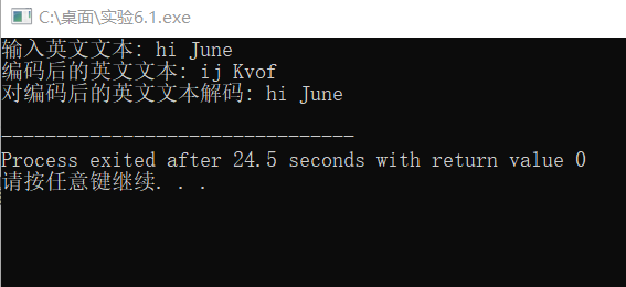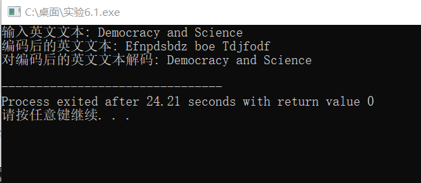 #include <stdio.h> #define N 80 void encoder(char *s); // 函数声明 void decoder(char *s); // 函数声明 int main() { char words[N]; printf("输入英文文本: "); gets(words); printf("编码后的英文文本: "); encoder(words); // 函数调用 printf("%s\n", words); printf("对编码后的英文文本解码: "); decoder(words); // 函数调用 printf("%s\n", words); return 0; } /*函数定义 功能:对s指向的字符串进行编码处理 编码规则: 对于a~z或A~Z之间的字母字符,用其后的字符替换; 其中,z用a替换,Z用A替换 其它非字母字符,保持不变 */ void encoder(char *s) { char *p; p=s; while(*p){ if(*p>=65&&*p<=89||*p>=97&&*p<=121) *p+=1; else if(*p==90||*p==122) *p-=25; p++;} } /*函数定义 功能:对s指向的字符串进行解码处理 解码规则: 对于a~z或A~Z之间的字母字符,用其前面的字符替换; 其中,a用z替换,A用Z替换 其它非字母字符,保持不变 */ void decoder(char *s) { int i, j = 0; for (i = 0; s[i] != '\0'; i++) j++; for (i = 0; i < j; i++) { if ((s[i] > 'a' && s[i] <= 'z') || (s[i] > 'A' && s[i] <= 'Z')) s[i] = s[i] - 1; else if ((s[i] == 'a') || (s[i] == 'A')) s[i] = s[i] + 25; }}