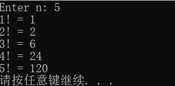 #include <stdio.h> #include <stdlib.h> long long fac(int n); int main() { int i, n; printf("Enter n: "); scanf("%d", &n); for (i = 1; i <= n; ++i) printf("%d! = %lld\n", i, fac(i)); system("pause"); return 0; } long long fac(int n) { static long long p = 1; printf("p = %lld\n", p); p = p * n; return p; }