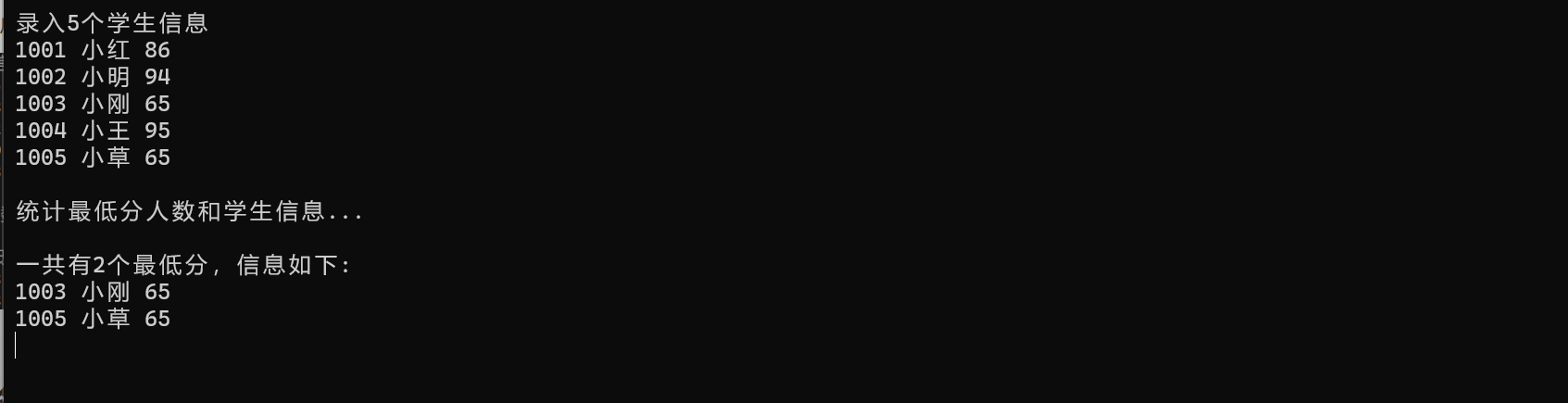 #define _CRT_SECURE_NO_WARNINGS #include <stdio.h> #define N 5 // 定义结构体类型struct student, 并定义STU为其别名 typedef struct student { long no; char name[20]; int score; } STU; // 函数声明 void input(STU s[], int n); int find_min_list(STU s[], STU t[], int n); void output(STU s[], int n); int main() { STU stu[N], min_list[N]; int count; printf("录入%d个学生信息\n", N); input(stu, N); printf("\n统计最低分人数和学生信息...\n"); count = find_min_list(stu, min_list, N); printf("\n一共有%d个最低分,信息如下:\n", count); output(min_list, count); return 0; } // 输入n个学生信息,存放在结构体数组s中 void input(STU s[], int n) { int i; for (i = 0; i < n; i++) scanf("%ld %s %d", &s[i].no, s[i].name, &s[i].score); } // 输出结构体s中n个元素信息 void output(STU s[], int n) { int i; for (i = 0; i < n; i++) printf("%ld %s %d\n", s[i].no, s[i].name, s[i].score); } // 在结构体数组s中,查找最低分学生的记录,将其存入结构体数组t中 // 形参n是结构体数组s中元素个数 // 函数返回最低分的学生人数 int find_min_list(STU s[], STU t[], int n) { int j = 0, min = 100; for (int i = 0; i < N; i++) { if (s[i].score < min) min = s[i].score; } for (int i = 0; i < N; i++) if (s[i].score == min) t[j++] = s[i]; return j; }