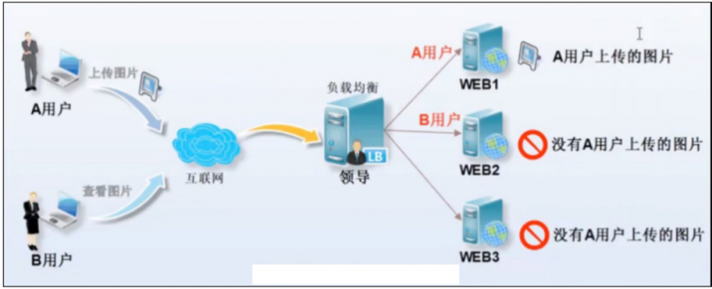 2.B用户访问A用户上传的图片,此时B用户被负载均衡调度至WEB2上,因为WEB2上没有这张图片,所以B用户无法看到A用户传的图片。