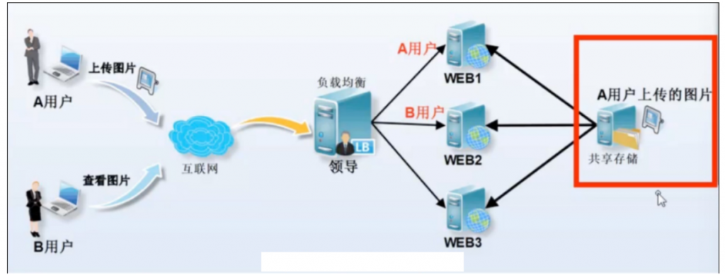 2.B用户访问A用户上传图片时,无论调度至WEB1还是WEB2,最终都会上共享存储访问对应的文件,这样就可以访问到资源了
