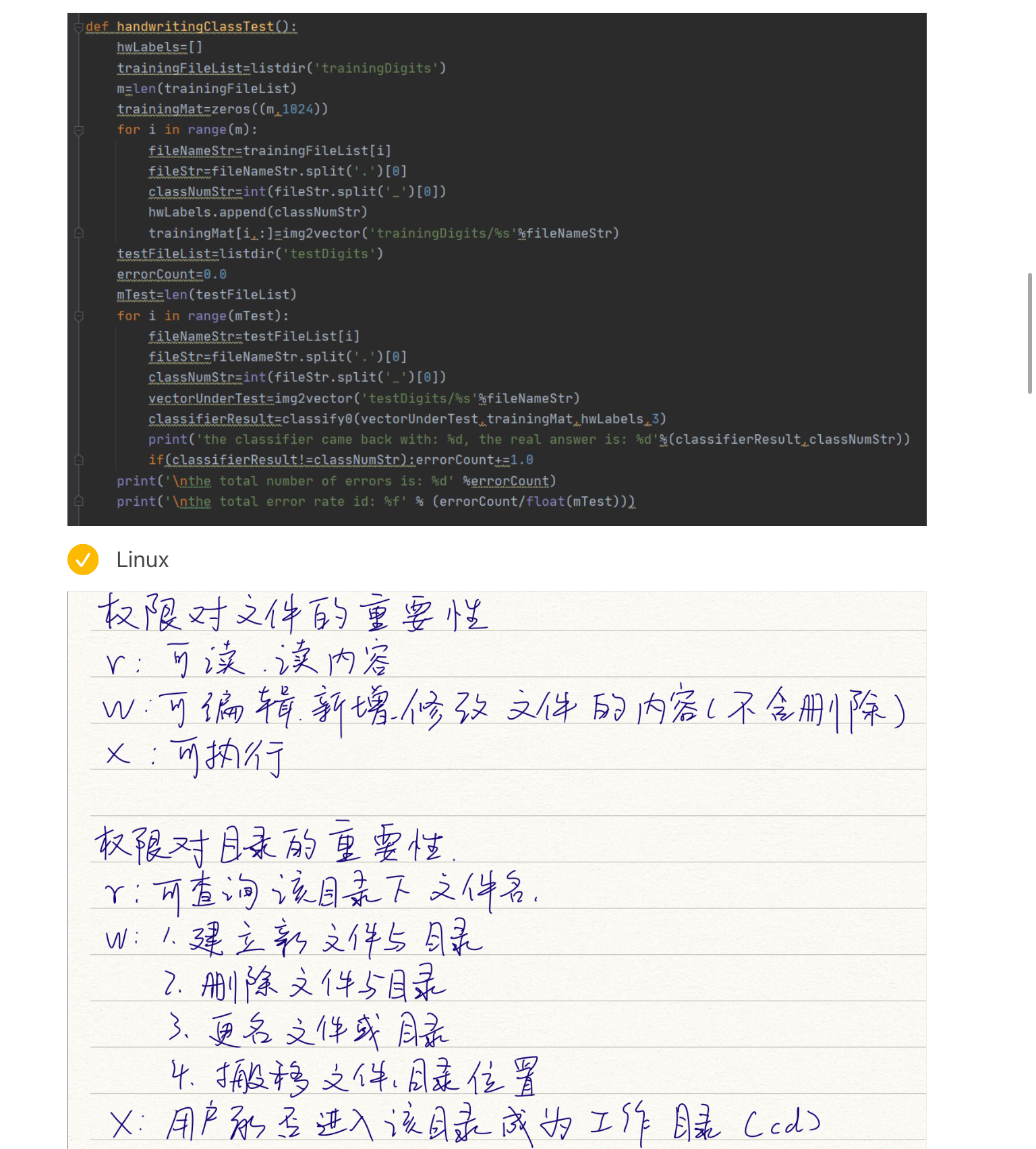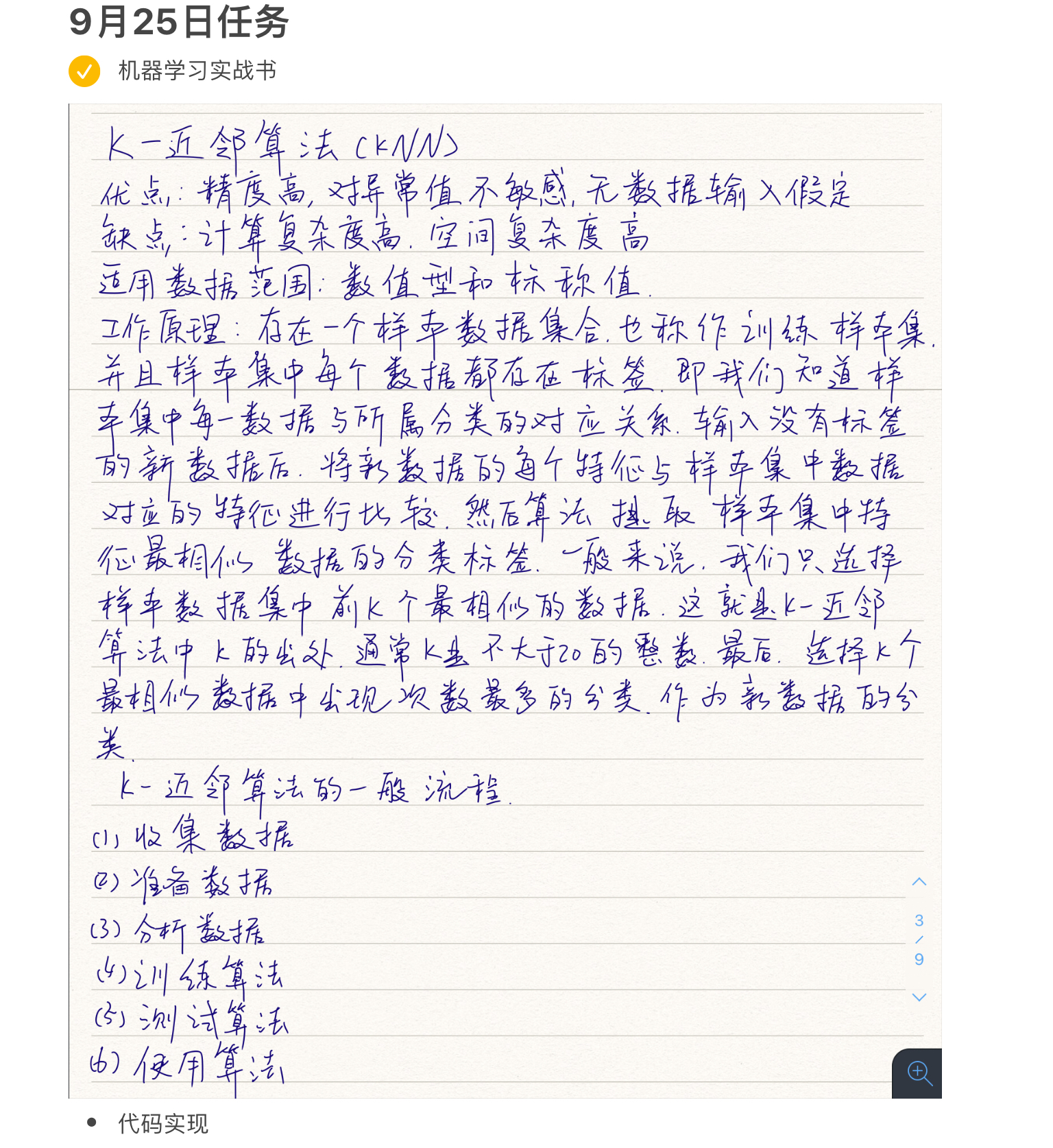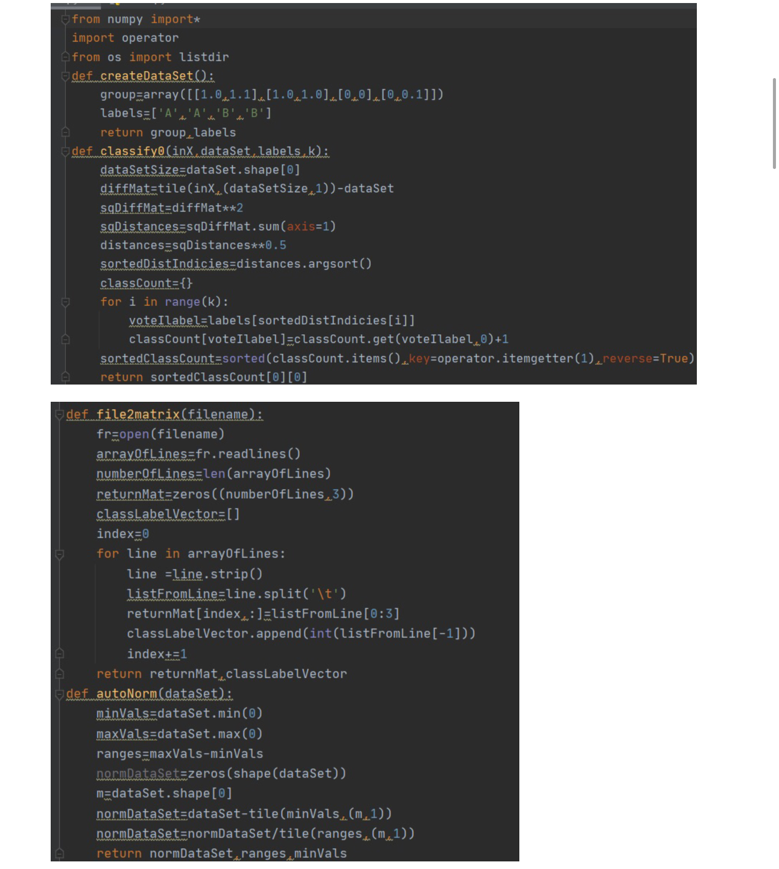 1 from numpy import* 2 import operator 3 from os import listdir 4 def createDataSet(): 5 group=array([[1.0,1.1],[1.0,1.0],[0,0],[0,0.1]]) 6 labels=['A','A','B','B'] 7 return group,labels 8 def classify0(inX,dataSet,labels,k): 9 dataSetSize=dataSet.shape[0] 10 diffMat=tile(inX,(dataSetSize,1))-dataSet 11 sqDiffMat=diffMat**2 12 sqDistances=sqDiffMat.sum(axis=1) 13 distances=sqDistances**0.5 14 sortedDistIndicies=distances.argsort() 15 classCount={} 16 for i in range(k): 17 voteIlabel=labels[sortedDistIndicies[i]] 18 classCount[voteIlabel]=classCount.get(voteIlabel,0)+1 19 sortedClassCount=sorted(classCount.items(),key=operator.itemgetter(1),reverse=True) 20 return sortedClassCount[0][0] 21 def file2matrix(filename): 22 fr=open(filename) 23 arrayOfLines=fr.readlines() 24 numberOfLines=len(arrayOfLines) 25 returnMat=zeros((numberOfLines,3)) 26 classLabelVector=[] 27 index=0 28 for line in arrayOfLines: 29 line =line.strip() 30 listFromLine=line.split('\t') 31 returnMat[index,:]=listFromLine[0:3] 32 classLabelVector.append(int(listFromLine[-1])) 33 index+=1 34 return returnMat,classLabelVector 35 def autoNorm(dataSet): 36 minVals=dataSet.min(0) 37 maxVals=dataSet.max(0) 38 ranges=maxVals-minVals 39 normDataSet=zeros(shape(dataSet)) 40 m=dataSet.shape[0] 41 normDataSet=dataSet-tile(minVals,(m,1)) 42 normDataSet=normDataSet/tile(ranges,(m,1)) 43 return normDataSet,ranges,minVals 44 def datingClassTest(): 45 hoRatio=0.10 46 datingDataMat,datingLabels=file2matrix('datingTestSet2.txt') 47 normMat,ranges,minVals=autoNorm(datingDataMat) 48 m=normMat.shape[0] 49 numTestVecs=int(m*hoRatio) 50 errorCount=0.0 51 for i in range(numTestVecs): 52 classifierResult=classify0(normMat[i,:],normMat[numTestVecs:m,:],datingLabels[numTestVecs:m],3) 53 print("the classifier came back with: %d, the real answer is: %d" % (classifierResult,datingLabels[i])) 54 if(classifierResult!=datingLabels[i]):errorCount+=1.0 55 print("the total error rate is: %f" % (errorCount/float(numTestVecs))) 56 def classifyPerson(): 57 resultList=['not at all','in small doses','in large doses'] 58 percnetTats=float(input("percentage of time spent playing video games?")) 59 ffMiles=float(input("frequent flier miles earned per year?")) 60 iceCream=float(input("liters of ice cream consumed per year?")) 61 datingDataMat,datingLabels=file2matrix('datingTestSet2.txt') 62 normMat,ranges,minVals=autoNorm(datingDataMat) 63 inArr=array([ffMiles,percnetTats,iceCream]) 64 classifierResult=classify0((inArr-minVals)/ranges,normMat,datingLabels,3) 65 print("You will probably like this person:",resultList[classifierResult-1]) 66 def img2vector(filename): 67 returnVect=zeros((1,1024)) 68 fr=open(filename) 69 for i in range(32): 70 lineStr=fr.readline() 71 for j in range(32): 72 returnVect[0,32*i+j]=int(lineStr[j]) 73 return returnVect 74 def handwritingClassTest(): 75 hwLabels=[] 76 trainingFileList=listdir('trainingDigits') 77 m=len(trainingFileList) 78 trainingMat=zeros((m,1024)) 79 for i in range(m): 80 fileNameStr=trainingFileList[i] 81 fileStr=fileNameStr.split('.')[0] 82 classNumStr=int(fileStr.split('_')[0]) 83 hwLabels.append(classNumStr) 84 trainingMat[i,:]=img2vector('trainingDigits/%s'%fileNameStr) 85 testFileList=listdir('testDigits') 86 errorCount=0.0 87 mTest=len(testFileList) 88 for i in range(mTest): 89 fileNameStr=testFileList[i] 90 fileStr=fileNameStr.split('.')[0] 91 classNumStr=int(fileStr.split('_')[0]) 92 vectorUnderTest=img2vector('testDigits/%s'%fileNameStr) 93 classifierResult=classify0(vectorUnderTest,trainingMat,hwLabels,3) 94 print('the classifier came back with: %d, the real answer is: %d'%(classifierResult,classNumStr)) 95 if(classifierResult!=classNumStr):errorCount+=1.0 96 print('\nthe total number of errors is: %d' %errorCount) 97 print('\nthe total error rate id: %f' % (errorCount/float(mTest)))