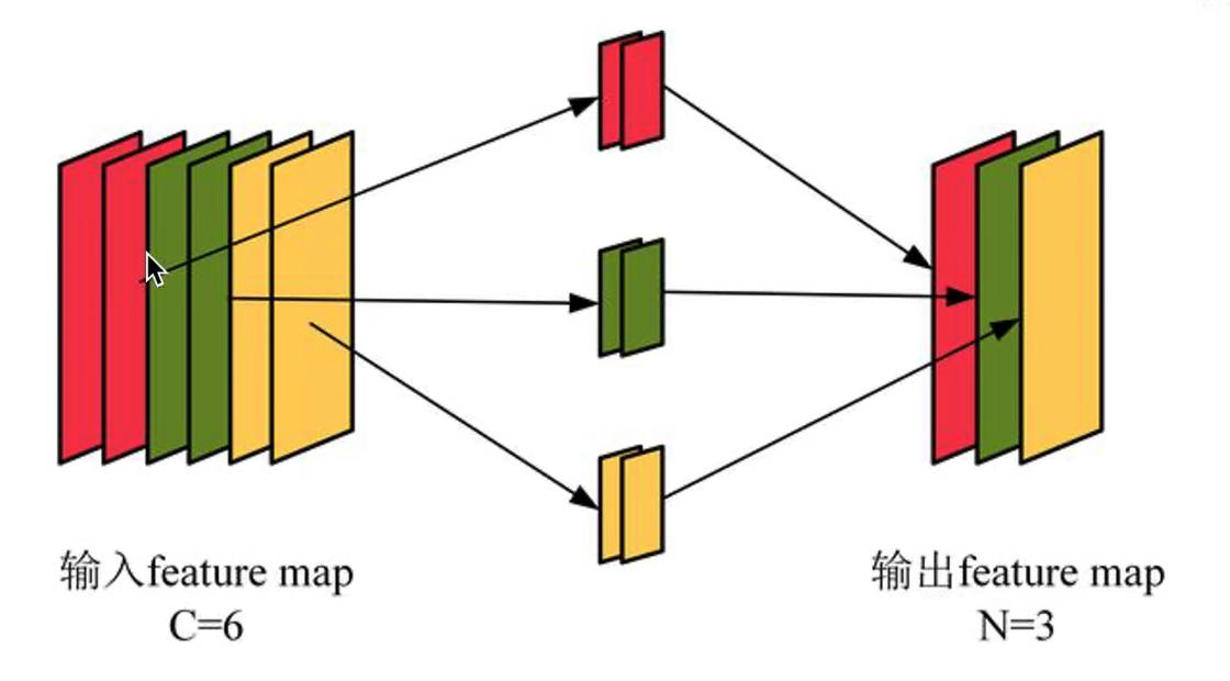 在分组卷积中,每个卷积核只处理部分通道,比如上图中,红色卷积核只处理红色的通道,绿色卷积核只处理绿色通道,黄色卷积核只处理黄色通道。此时每个卷积核有2个通道,每个卷积核生成一张特征图。