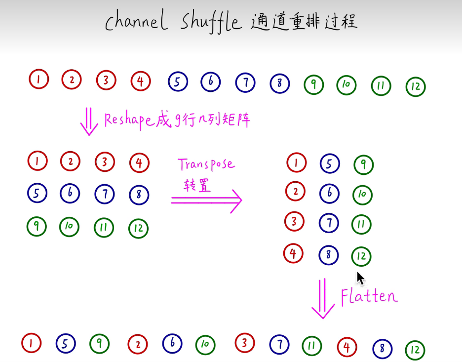 举个例子来说,如下图。分组卷积生成的三组特征图,第一组1~4;第二组5~8;第三组9~12。先将特征图重塑,为三行N列的矩形。然后进行转置,变成N行三列。最后压平,从二维tensor变成一维tensor,每一组的特征图交叉组合在一起。实现各组之间的信息交融。