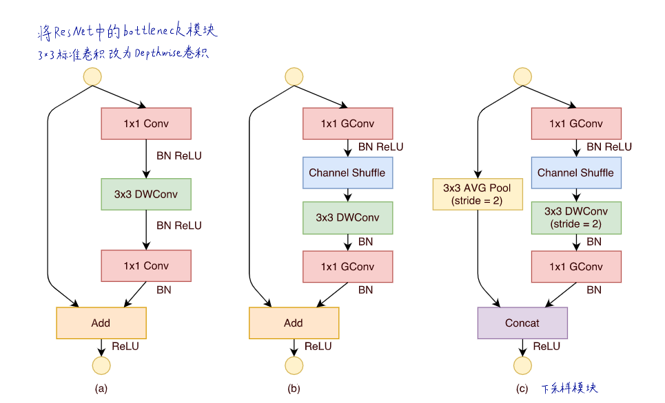 这里需要注意(b)中第一个分组卷积降维,然后通道重排,在进行3*3的DepthWise卷积,最后使用1*1的分组卷积升维,目的还是让残差前后的shape一致,保证可以进行Add操作。