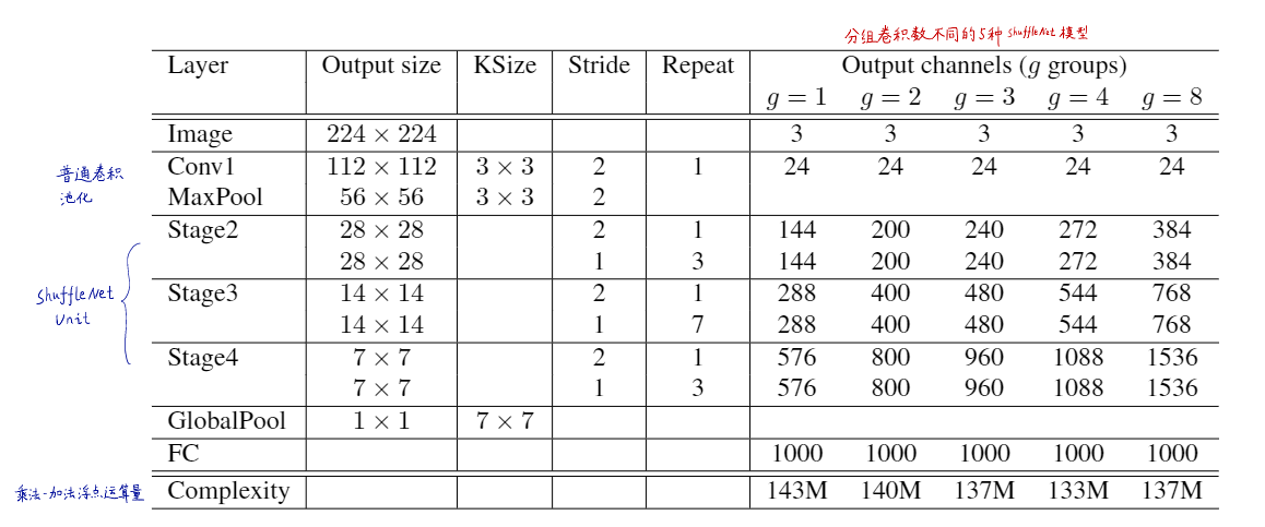上图为不同分组数的ShuffleNet网络结构,通常我们将g=3的那一个网络作为baseline Network