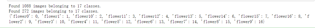 1 # 训练集数据生成器,可以在训练时自动产生数据进行训练 2 # 从'data/train'获得训练集数据 3 # 获得数据后会把图片resize为image_size×image_size的大小 4 # generator每次会产生batch_size个数据 5 train_generator = train_datagen.flow_from_directory( 6 '../data/train', 7 target_size=(image_size, image_size), 8 batch_size=batch_size, 9 ) 10 11 # 测试集数据生成器 12 test_generator = test_datagen.flow_from_directory( 13 '../data/test', 14 target_size=(image_size, image_size), 15 batch_size=batch_size, 16 ) 17 # 字典的键为17个文件夹的名字,值为对应的分类编号 18 print(train_generator.class_indices)