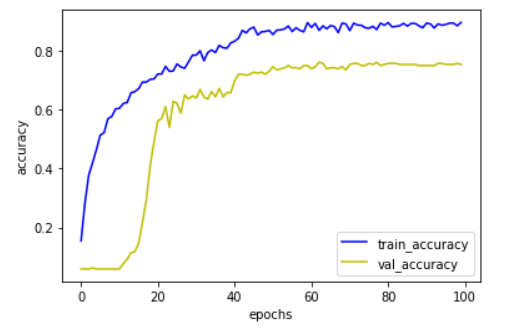 1 Epoch 1/100 2 34/34 [==============================] - 18s 526ms/step - loss: 2.9157 - accuracy: 0.1544 - val_loss: 2.8353 - val_accuracy: 0.0588 3 Epoch 2/100 4 34/34 [==============================] - 16s 478ms/step - loss: 2.2678 - accuracy: 0.2822 - val_loss: 2.8387 - val_accuracy: 0.0588 5 Epoch 3/100 6 34/34 [==============================] - 16s 483ms/step - loss: 1.9987 - accuracy: 0.3778 - val_loss: 2.8482 - val_accuracy: 0.0588 7 Epoch 4/100 8 34/34 [==============================] - 16s 481ms/step - loss: 1.8269 - accuracy: 0.4200 - val_loss: 2.8607 - val_accuracy: 0.0625 9 Epoch 5/100 10 34/34 [==============================] - 17s 487ms/step - loss: 1.7022 - accuracy: 0.4651 - val_loss: 2.8800 - val_accuracy: 0.0588 11 Epoch 6/100 12 34/34 [==============================] - 16s 479ms/step - loss: 1.5436 - accuracy: 0.5138 - val_loss: 2.9101 - val_accuracy: 0.0588 13 Epoch 7/100 14 34/34 [==============================] - 16s 484ms/step - loss: 1.4806 - accuracy: 0.5221 - val_loss: 2.9455 - val_accuracy: 0.0588 15 Epoch 8/100 16 34/34 [==============================] - 17s 486ms/step - loss: 1.3658 - accuracy: 0.5699 - val_loss: 3.0113 - val_accuracy: 0.0588 17 Epoch 9/100 18 34/34 [==============================] - 16s 478ms/step - loss: 1.3244 - accuracy: 0.5772 - val_loss: 3.0792 - val_accuracy: 0.0588 19 Epoch 10/100 20 34/34 [==============================] - 16s 480ms/step - loss: 1.2401 - accuracy: 0.6029 - val_loss: 3.2077 - val_accuracy: 0.0588 21 Epoch 11/100 22 34/34 [==============================] - 16s 480ms/step - loss: 1.1940 - accuracy: 0.6048 - val_loss: 3.3061 - val_accuracy: 0.0588 23 Epoch 12/100 24 34/34 [==============================] - 16s 480ms/step - loss: 1.1689 - accuracy: 0.6213 - val_loss: 3.4508 - val_accuracy: 0.0772 25 Epoch 13/100 26 34/34 [==============================] - 16s 481ms/step - loss: 1.1282 - accuracy: 0.6241 - val_loss: 3.5842 - val_accuracy: 0.0919 27 Epoch 14/100 28 34/34 [==============================] - 16s 479ms/step - loss: 1.0759 - accuracy: 0.6572 - val_loss: 3.5697 - val_accuracy: 0.1140 29 Epoch 15/100 30 34/34 [==============================] - 17s 488ms/step - loss: 1.0264 - accuracy: 0.6618 - val_loss: 3.6231 - val_accuracy: 0.1176 31 Epoch 16/100 32 34/34 [==============================] - 16s 475ms/step - loss: 1.0210 - accuracy: 0.6719 - val_loss: 3.3065 - val_accuracy: 0.1471 33 Epoch 17/100 34 34/34 [==============================] - 16s 477ms/step - loss: 0.9543 - accuracy: 0.6939 - val_loss: 2.9929 - val_accuracy: 0.2169 35 Epoch 18/100 36 34/34 [==============================] - 17s 493ms/step - loss: 0.9405 - accuracy: 0.6939 - val_loss: 2.3133 - val_accuracy: 0.2941 37 Epoch 19/100 38 34/34 [==============================] - 17s 488ms/step - loss: 0.9069 - accuracy: 0.7031 - val_loss: 1.8180 - val_accuracy: 0.4081 39 Epoch 20/100 40 34/34 [==============================] - 17s 491ms/step - loss: 0.8797 - accuracy: 0.7050 - val_loss: 1.7820 - val_accuracy: 0.4926 41 Epoch 21/100 42 34/34 [==============================] - 17s 493ms/step - loss: 0.8911 - accuracy: 0.7215 - val_loss: 1.4993 - val_accuracy: 0.5625 43 Epoch 22/100 44 34/34 [==============================] - 17s 496ms/step - loss: 0.8480 - accuracy: 0.7215 - val_loss: 1.4438 - val_accuracy: 0.5699 45 Epoch 23/100 46 34/34 [==============================] - 17s 496ms/step - loss: 0.7861 - accuracy: 0.7472 - val_loss: 1.2822 - val_accuracy: 0.6103 47 Epoch 24/100 48 34/34 [==============================] - 16s 477ms/step - loss: 0.8111 - accuracy: 0.7307 - val_loss: 1.7404 - val_accuracy: 0.5404 49 Epoch 25/100 50 34/34 [==============================] - 16s 477ms/step - loss: 0.7855 - accuracy: 0.7316 - val_loss: 1.4184 - val_accuracy: 0.6287 51 Epoch 26/100 52 34/34 [==============================] - 17s 491ms/step - loss: 0.7679 - accuracy: 0.7555 - val_loss: 1.2750 - val_accuracy: 0.6213 53 Epoch 27/100 54 34/34 [==============================] - 16s 481ms/step - loss: 0.7451 - accuracy: 0.7454 - val_loss: 1.4109 - val_accuracy: 0.5882 55 Epoch 28/100 56 34/34 [==============================] - 16s 482ms/step - loss: 0.7201 - accuracy: 0.7408 - val_loss: 1.3238 - val_accuracy: 0.6507 57 Epoch 29/100 58 34/34 [==============================] - 16s 475ms/step - loss: 0.7238 - accuracy: 0.7629 - val_loss: 1.2997 - val_accuracy: 0.6360 59 Epoch 30/100 60 34/34 [==============================] - 16s 482ms/step - loss: 0.6587 - accuracy: 0.7849 - val_loss: 1.2941 - val_accuracy: 0.6471 61 Epoch 31/100 62 34/34 [==============================] - 17s 488ms/step - loss: 0.6508 - accuracy: 0.7858 - val_loss: 1.4063 - val_accuracy: 0.6397 63 Epoch 32/100 64 34/34 [==============================] - 17s 495ms/step - loss: 0.6294 - accuracy: 0.8006 - val_loss: 1.1997 - val_accuracy: 0.6691 65 Epoch 33/100 66 34/34 [==============================] - 16s 482ms/step - loss: 0.6579 - accuracy: 0.7665 - val_loss: 1.2146 - val_accuracy: 0.6434 67 Epoch 34/100 68 34/34 [==============================] - 16s 481ms/step - loss: 0.6207 - accuracy: 0.7941 - val_loss: 1.3010 - val_accuracy: 0.6360 69 Epoch 35/100 70 34/34 [==============================] - 16s 480ms/step - loss: 0.5873 - accuracy: 0.8033 - val_loss: 1.2448 - val_accuracy: 0.6618 71 Epoch 36/100 72 34/34 [==============================] - 16s 477ms/step - loss: 0.5755 - accuracy: 0.7941 - val_loss: 1.2584 - val_accuracy: 0.6434 73 Epoch 37/100 74 34/34 [==============================] - 17s 491ms/step - loss: 0.5668 - accuracy: 0.8189 - val_loss: 1.1914 - val_accuracy: 0.6728 75 Epoch 38/100 76 34/34 [==============================] - 16s 485ms/step - loss: 0.5527 - accuracy: 0.8107 - val_loss: 1.2917 - val_accuracy: 0.6434 77 Epoch 39/100 78 34/34 [==============================] - 16s 475ms/step - loss: 0.5715 - accuracy: 0.8088 - val_loss: 1.2613 - val_accuracy: 0.6581 79 Epoch 40/100 80 34/34 [==============================] - 16s 477ms/step - loss: 0.5286 - accuracy: 0.8272 - val_loss: 1.2632 -