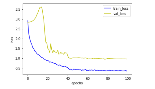 1 # 画出训练集loss曲线图 2 plt.plot(np.arange(epochs),history.history['loss'],c='b',label='train_loss') 3 # 画出验证集loss曲线图 4 plt.plot(np.arange(epochs),history.history['val_loss'],c='y',label='val_loss') 5 # 图例 6 plt.legend() 7 # x坐标描述 8 plt.xlabel('epochs') 9 # y坐标描述 10 plt.ylabel('loss') 11 # 显示图像 12 plt.show()