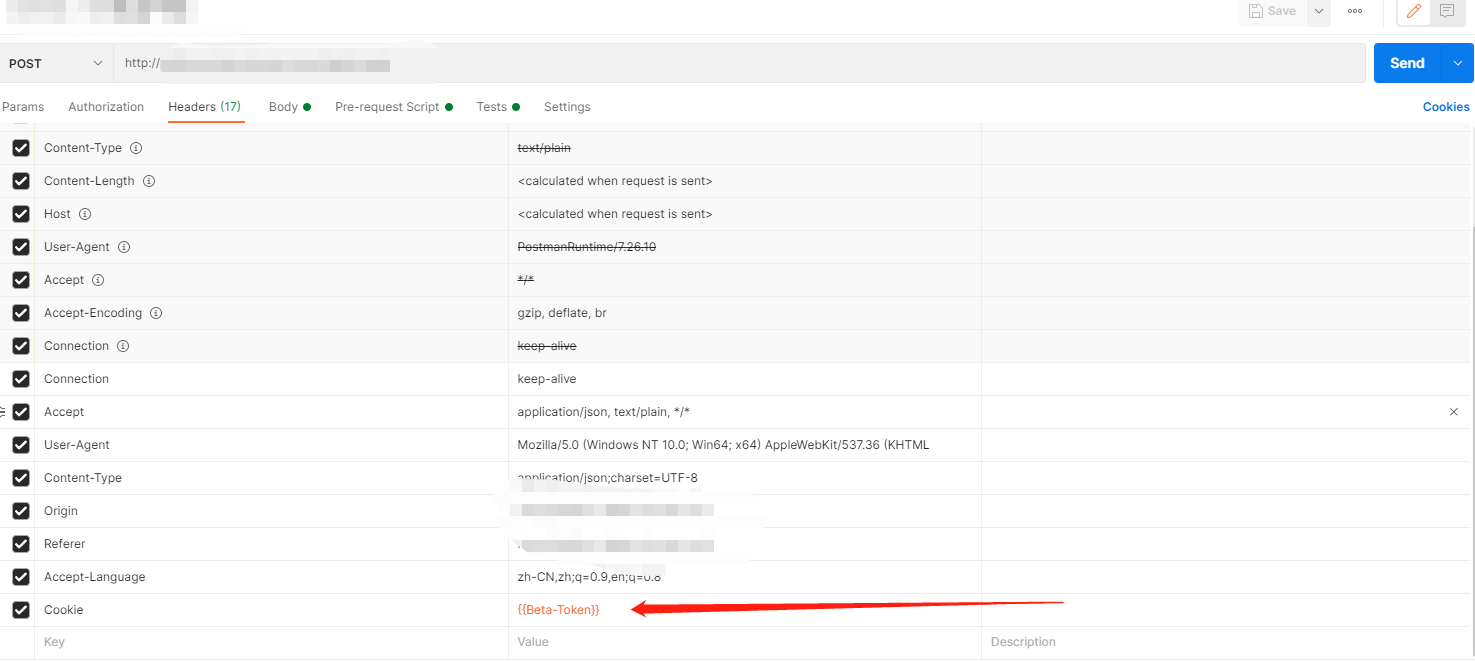 如图所示,如果不知道怎么生成这个页面,有个老办法了,登录一下自己的账户,到你要测试的页面去,把请求复制成curlbash,导入postman就是,然后你看headers就和我一样了