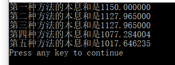 1 #include<stdio.h> 2 #include<math.h> 3 int main() 4 { 5 double r1=0.015,r2=0.021,r3=0.0275,r5=0.03,r=0.0035; 6 double p1,p2,p3,p4,p5; 7 int p=1000; 8 p1=p*pow((1+5*r5),1); 9 p2=p*pow((1+2*r2),1)*pow((1+3*r3),1); 10 p3=p*pow((1+3*r3),1)*pow((1+2*r2),1); 11 p4=p*pow((1+1*r1),5); 12 p5=p*pow((1+r/4.0),4*5); 13 printf("第一种方法的本息和是%f\n",p1); 14 printf("第二种方法的本息和是%f\n",p2); 15 printf("第三种方法的本息和是%f\n",p3); 16 printf("第四种方法的本息和是%f\n",p4); 17 printf("第五种方法的本息和是%f\n",p5); 18 return 0; 19 }