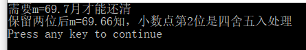1 #include<stdio.h> 2 #include<math.h> 3 int main() 4 { 5 int d=300000,p=6000; 6 double r=0.01,m; 7 m=log10(p/(p-d*r))/log10(1+r); 8 printf("需要m=%.1f月才能还清\n",m); 9 printf("保留两位后m=%.2f知,小数点第2位是四舍五入处理\n",m); 10 return 0; 11 }