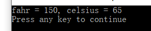 1 #include <stdio.h> 2 int main(){ 3 int fahr=150,celsius; 4 celsius=5*(fahr-32)/9; 5 printf("fahr = %d, celsius = %d",fahr,celsius); 6 return 0; 7 }
