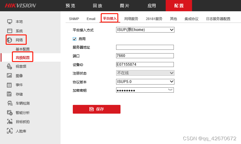 点击配置→网络→高级配置→平台接入→Ehome/ISUP,可查看ISUP(原Ehome)协议版本,可选5.0还是2.0
