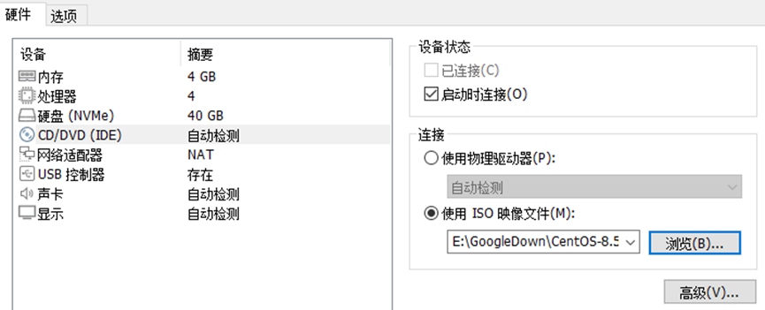 可以设置【内存】,【处理器】,选择【CD/DVD(IDE)】→【使用ISO映像文件】,选择下载的CentOS 8 文件。