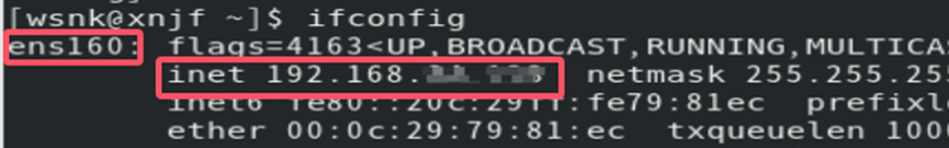 查看虚拟机IP 地址,打开虚拟机终端输入命令:ifconfig。找到【ens】中的【inet】,后面的地址就是虚拟机IP 地址。