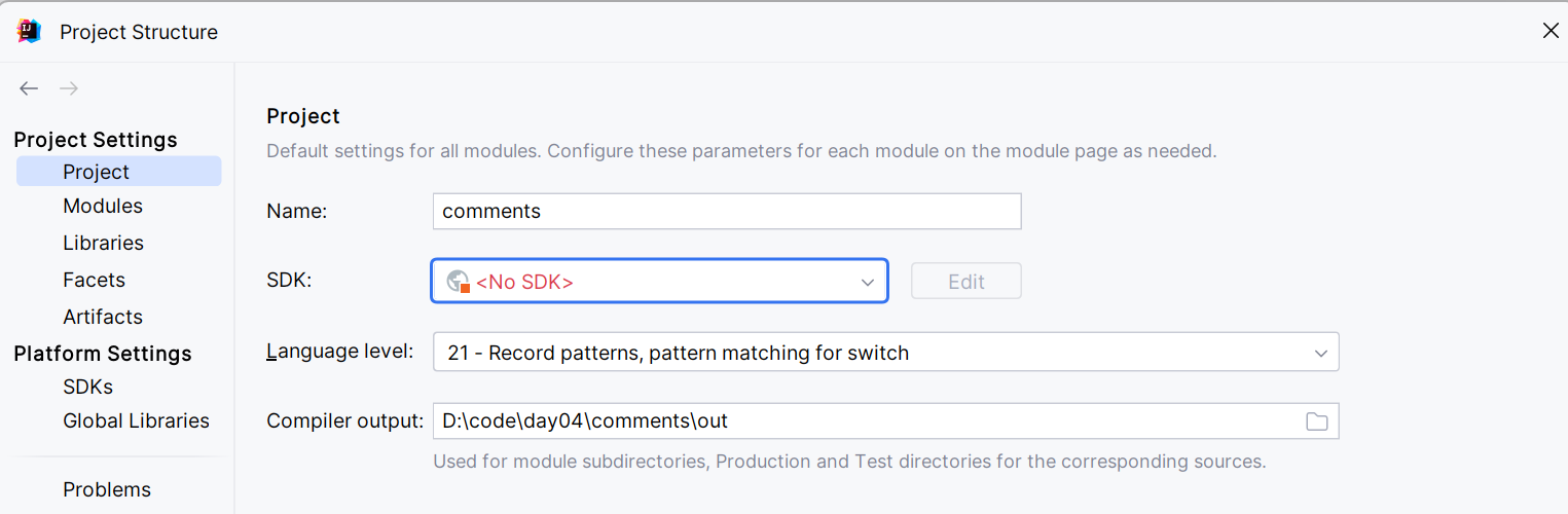 3.file→project structure,设置sdk及language level, language level必须与sdk版本一致,设置好后点击apply![]()