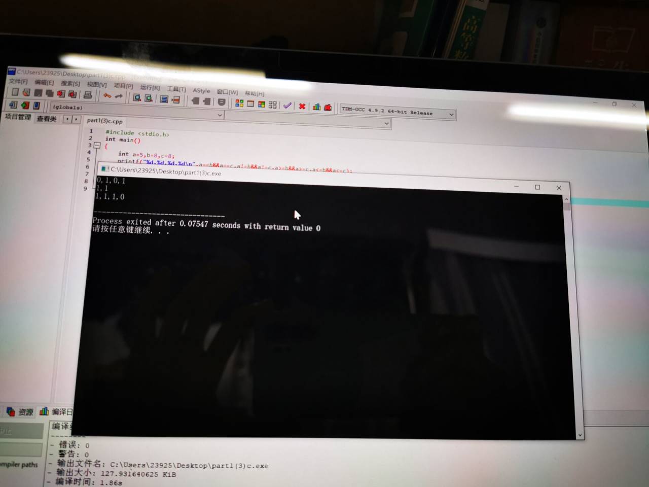 printf("%d,%d,%d,%d\n",!(a==b),!(a>=b),!(a>=c),!(a<=b));
