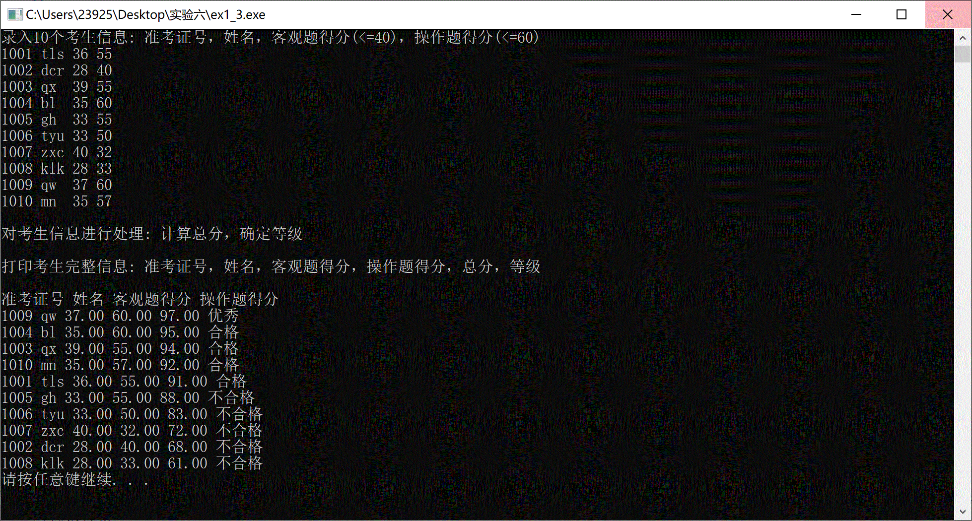 printf("\n打印考生完整信息: 准考证号,姓名,客观题得分,操作题得分,总分,等级\n");