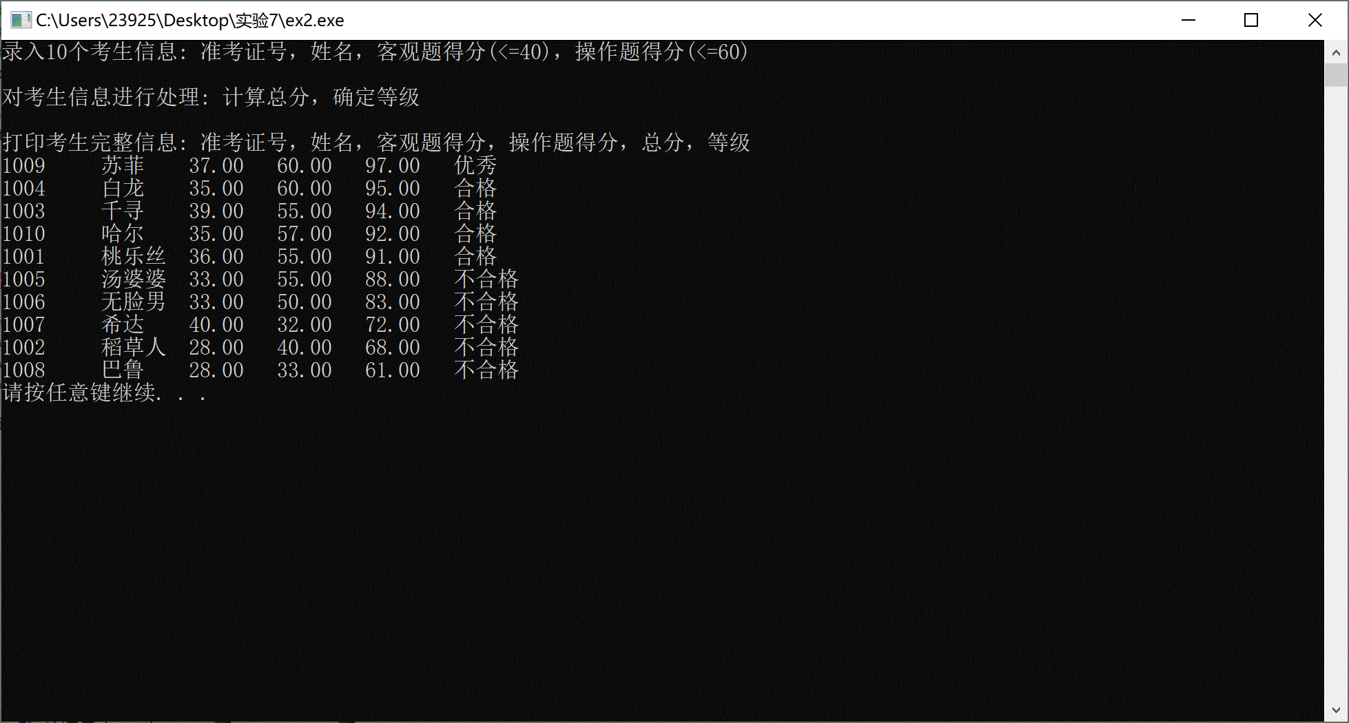 printf("\n打印考生完整信息: 准考证号,姓名,客观题得分,操作题得分,总分,等级\n");