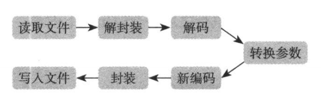 ffmpeg 工具主要的用途是编码,解码,转码及媒体格式的转换,ffmpeg的主要工作流程相对比较简单,具体如下:解封装,解码,编码,封装。其中需要经过6个步骤,1)读取输入源;2)音视频解封装,3)解码每一帧音视频数据。4)编码每一帧音视频数据。5)音视频的重新封装;6)输出目标。如下图所示: