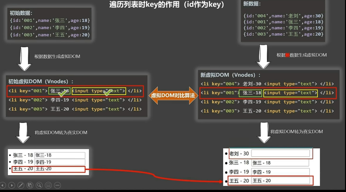 虚拟dom对比算法:不一样的地方转成新的结点,生成新的真实dom,一样的将旧的地方复用,没有的直接生成新的。