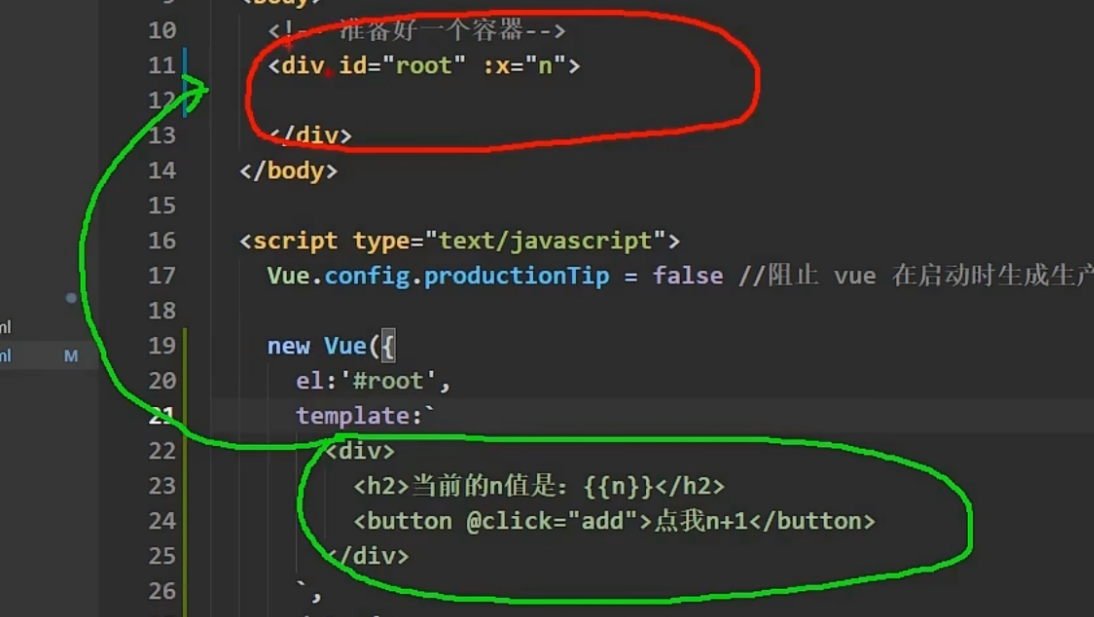 template:' (必须包含根元素) '中内容(即绿色部分)会取代vue所绑定的div(即红色部分)