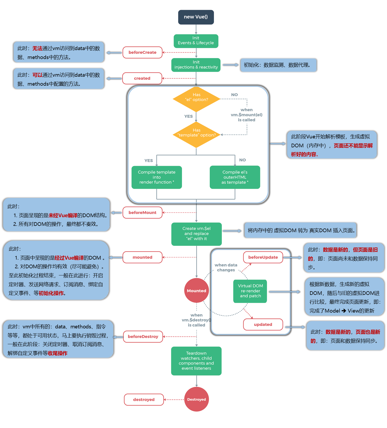 3.一般不会再beforeDestroy操作数据,因为即便操作数据,也不会再触发更新流程了。