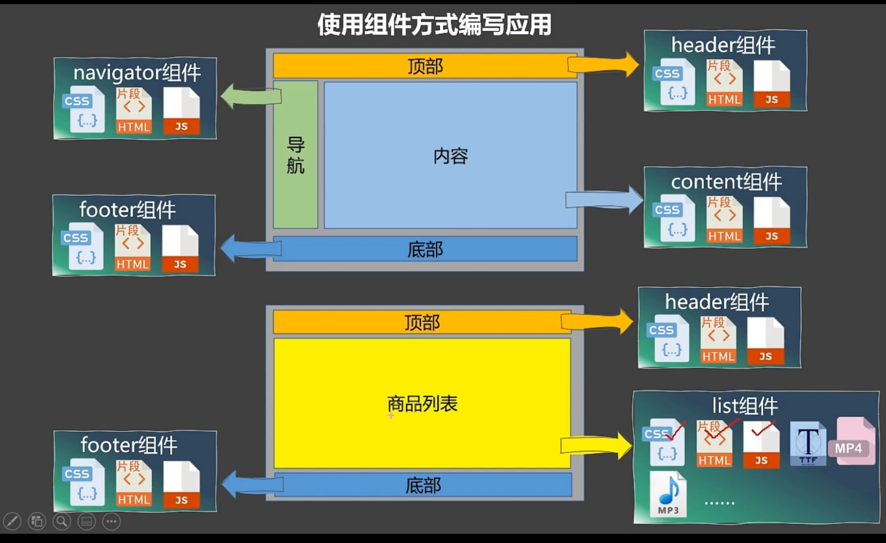 组件(实现应用中局部功能代码(css、html、js)和资源的集合):