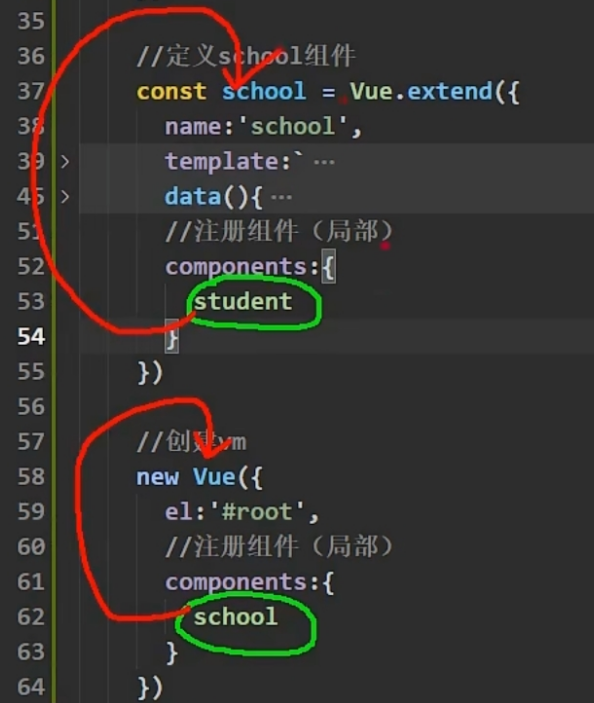 2.我们只需要写<school/>或<school></school>,Vue解析时会帮我们创建school组件的实例对象,即Vue帮我们执行的:new VueComponent(options)。