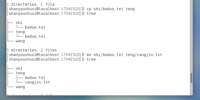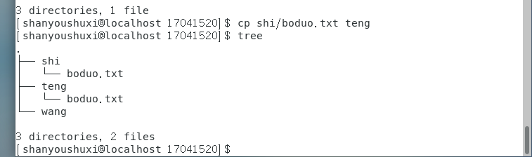 7.把当前目录的第一个子目录中文件boduo.txt复制到第二个子目录中,然后再次把第一个子目录中的boduo.txt复制到第三个子目录并命名为longze.txt,最后把第一个子目录中文件boduo.txt重命名为jieyi.txt。通过tree命令查看当前目录情况。